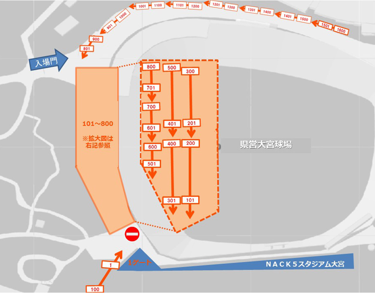 本抽選結果に基づき、キックオフ3時間30分前となる10時30分より整理券配布を実施します。10時30分までに係員の誘導のもと、抽選結果の整理番号順に待機列形成場所にお申込者およびご同伴者全員でお並びください。待機列形成場所はお申込時に選択した入場ゲート、整理番号によって異なりますので、1ゲートから入場される方は以下の図をご確認ください。2ゲートから入場される方は2ゲート前階段下にお並びください。