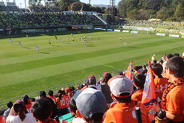 交流戦の後はトップチームを応援。試合前にはウォーミングアップに向かう選手をハイタッチで送り出し、試合中はスタンドから大きな声で選手に声援を送りました。J1昇格に向けた重要な試合として、多くのアルディージャサポーターの皆さんが来場し、スタジアムにも緊張感が溢れる中、選手のプレー歓声を上げ、みんなで一つになって応援できたことは、貴重な体験となりました。