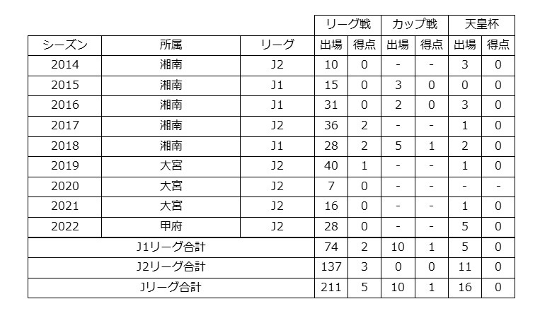 ■選手歴:大増サンライズFC - 大宮アルディージャJr.ユース - 大宮アルディージャユース - 東洋大 - 湘南ベルマーレ - 大宮アルディージャ - ヴァンフォーレ甲府