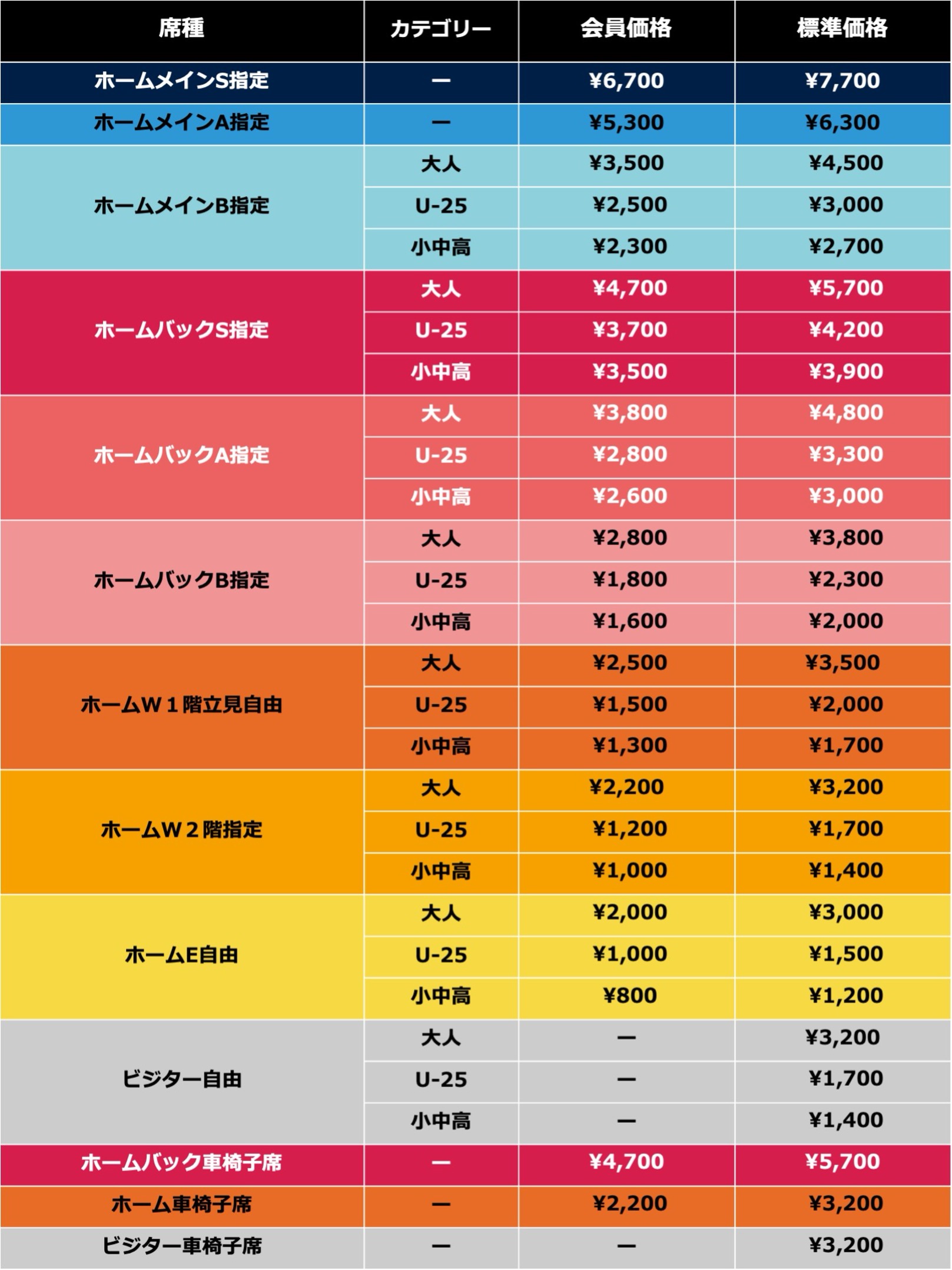・席種区分「シニア」は廃止となります。・「U-25」と「小中高」の対象席種を拡張します。
