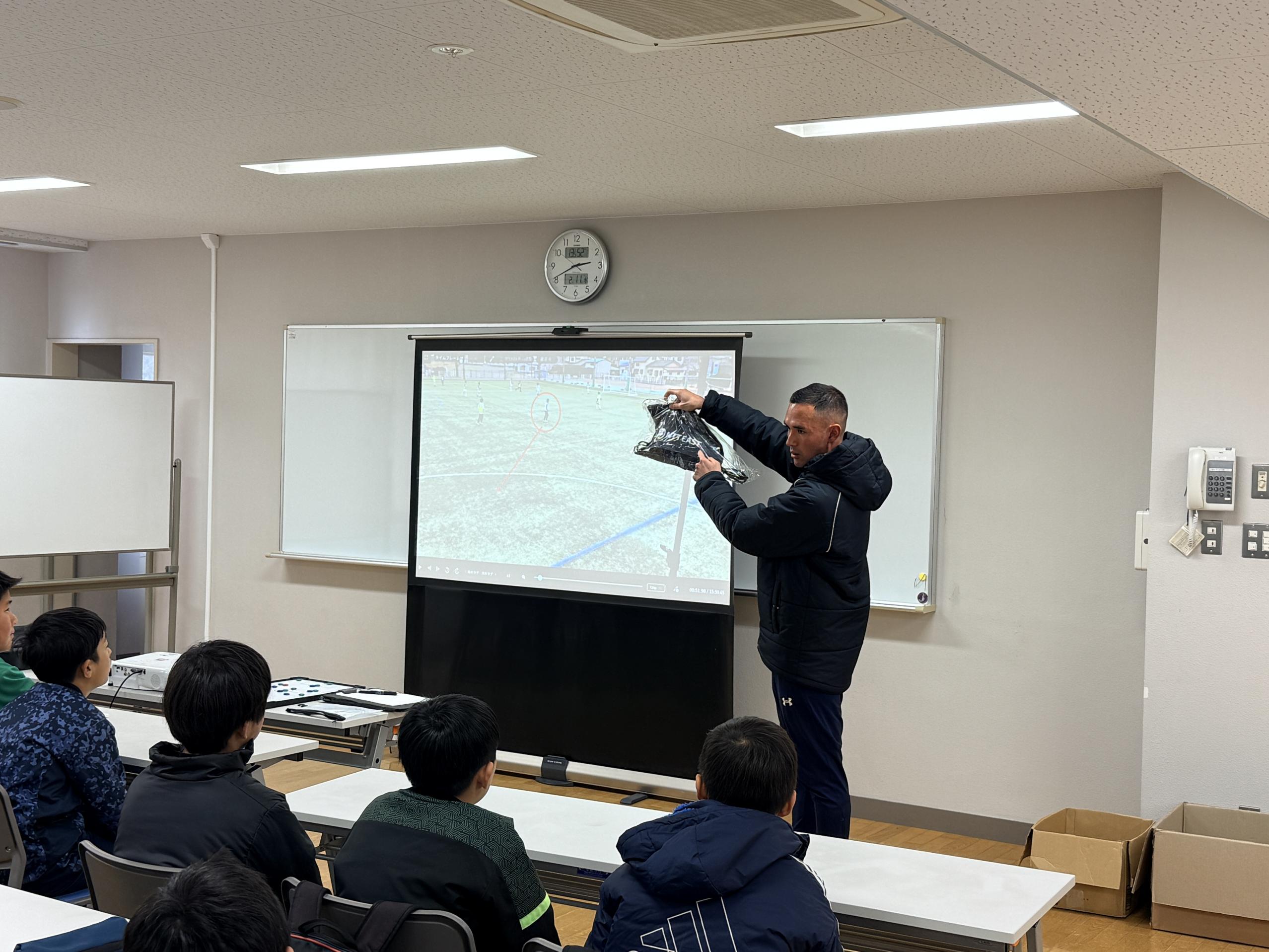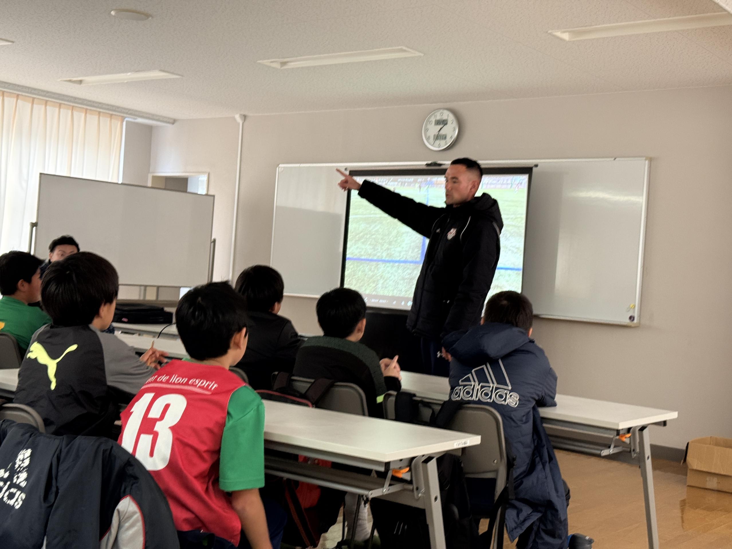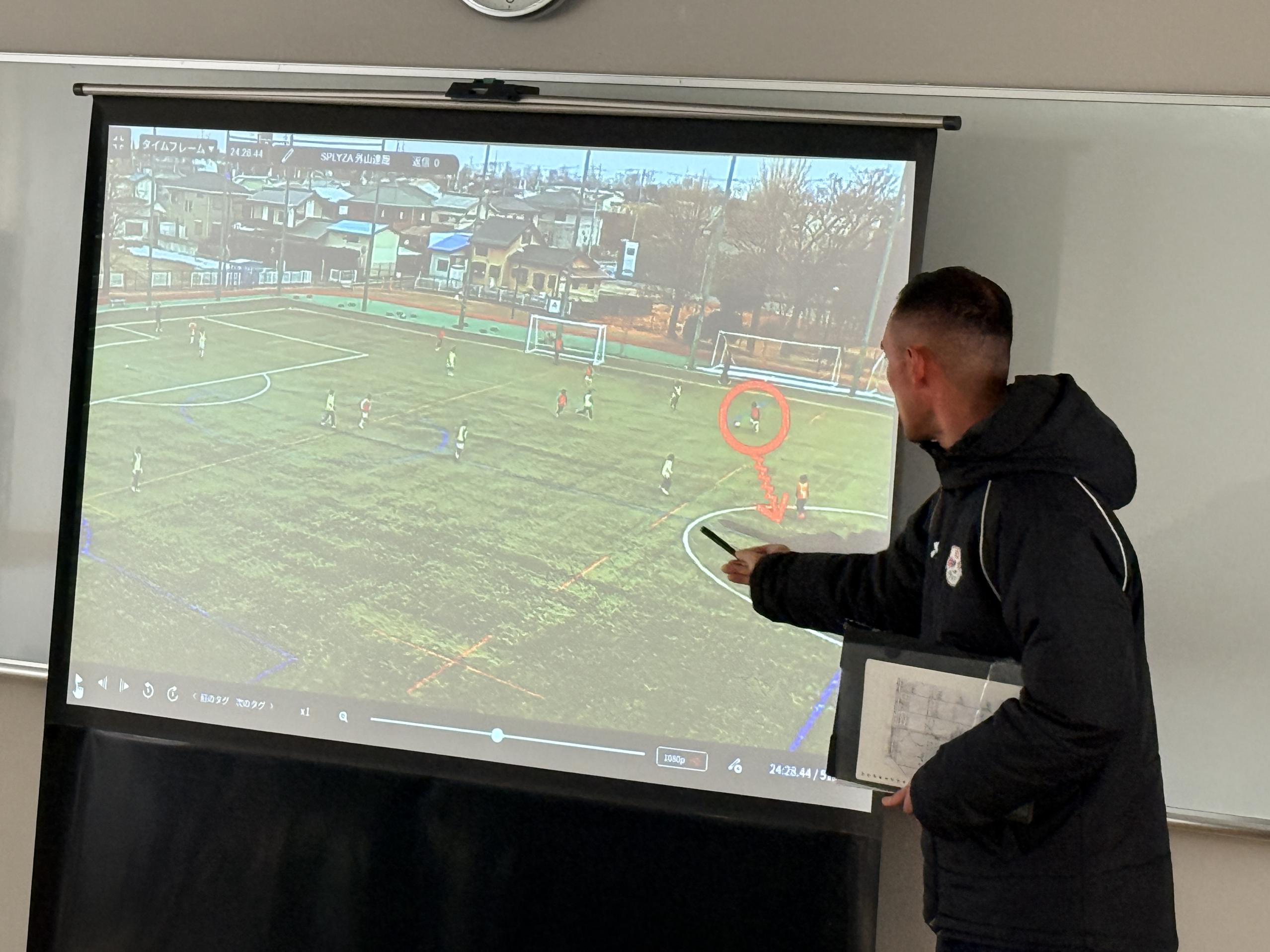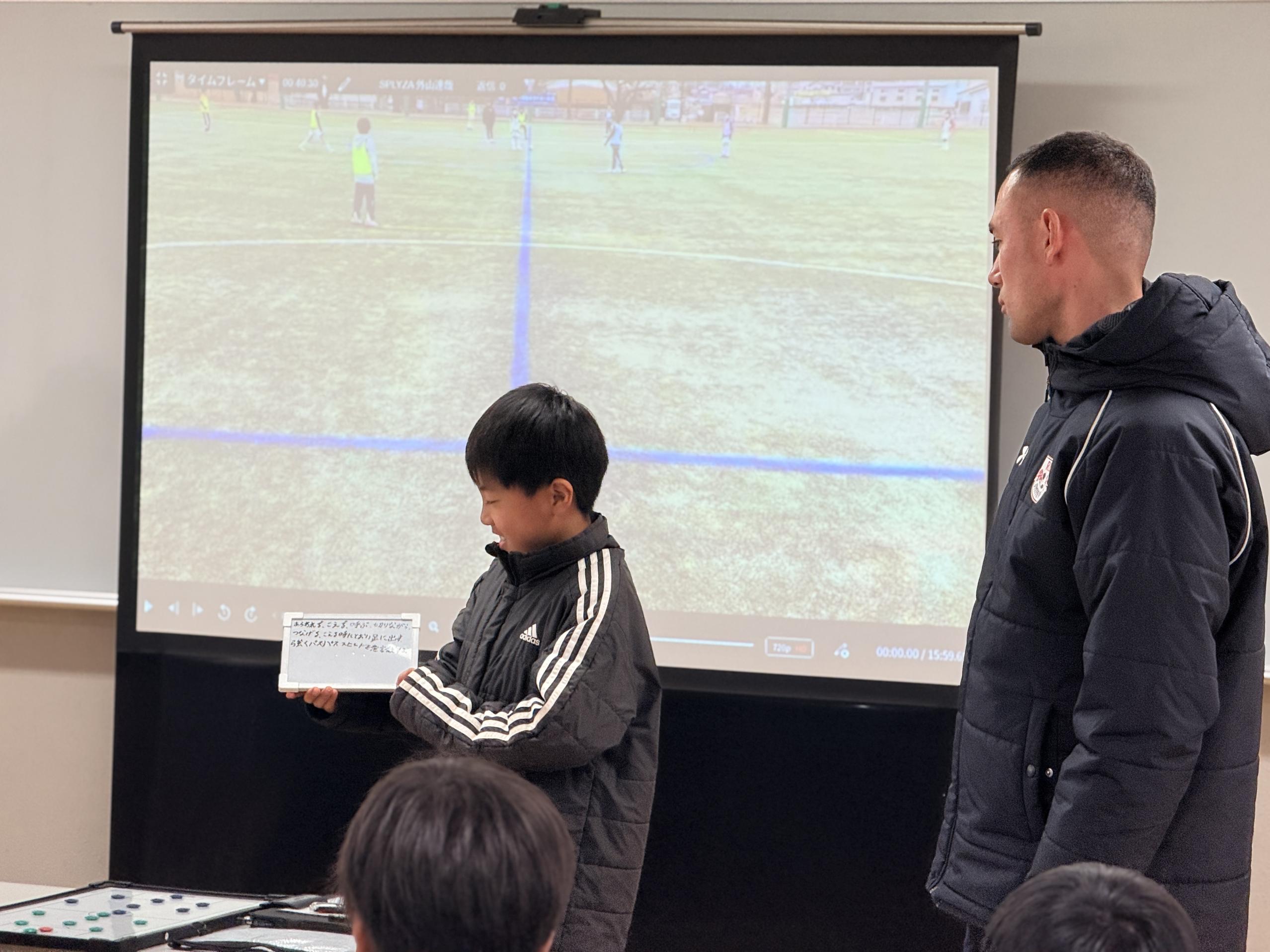 試合形式のトレーニングを撮影した映像を見ながら、プレーの改善について子どもたち自らがディスカッションし、RB大宮アルディージャのサッカースクールコーチがフィードバック、指導などの振り返りを実施。指導内容への理解を深めることだけでなく、子どもたち自身がプレーを客観的に見ることで、課題発見、解決力を養い、”考える力”を身につけることを目的としています。