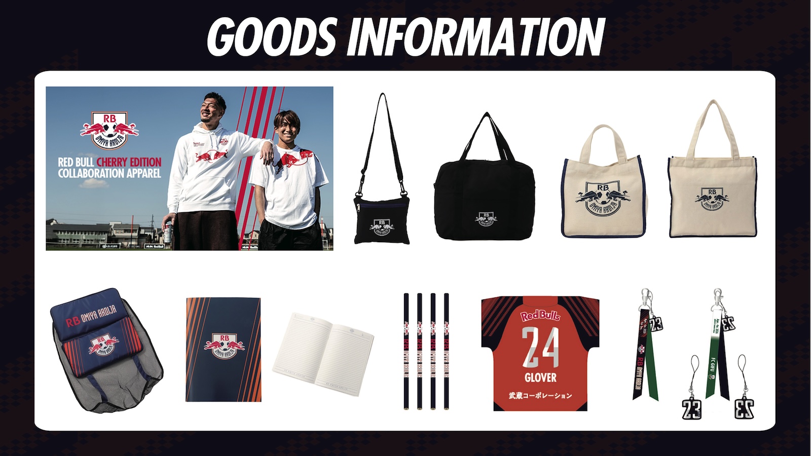 「レッドブル チェリーエディション」イメージをベースにレッドブル本社のプロダクト企画チームとの共同開発により誕生した、「レッドブル チェリーエディション限定コラボアパレル」が登場します。「レッドブル チェリーエディション」の世界観を反映した特別仕様となっていて、赤と白のカラーが特徴のデザインとなります。レッドブルの缶とRB大宮アルディージャがコラボレーションした初めてのアパレルとなり、大きく描かれたブルがチームの力強さを表現しています。