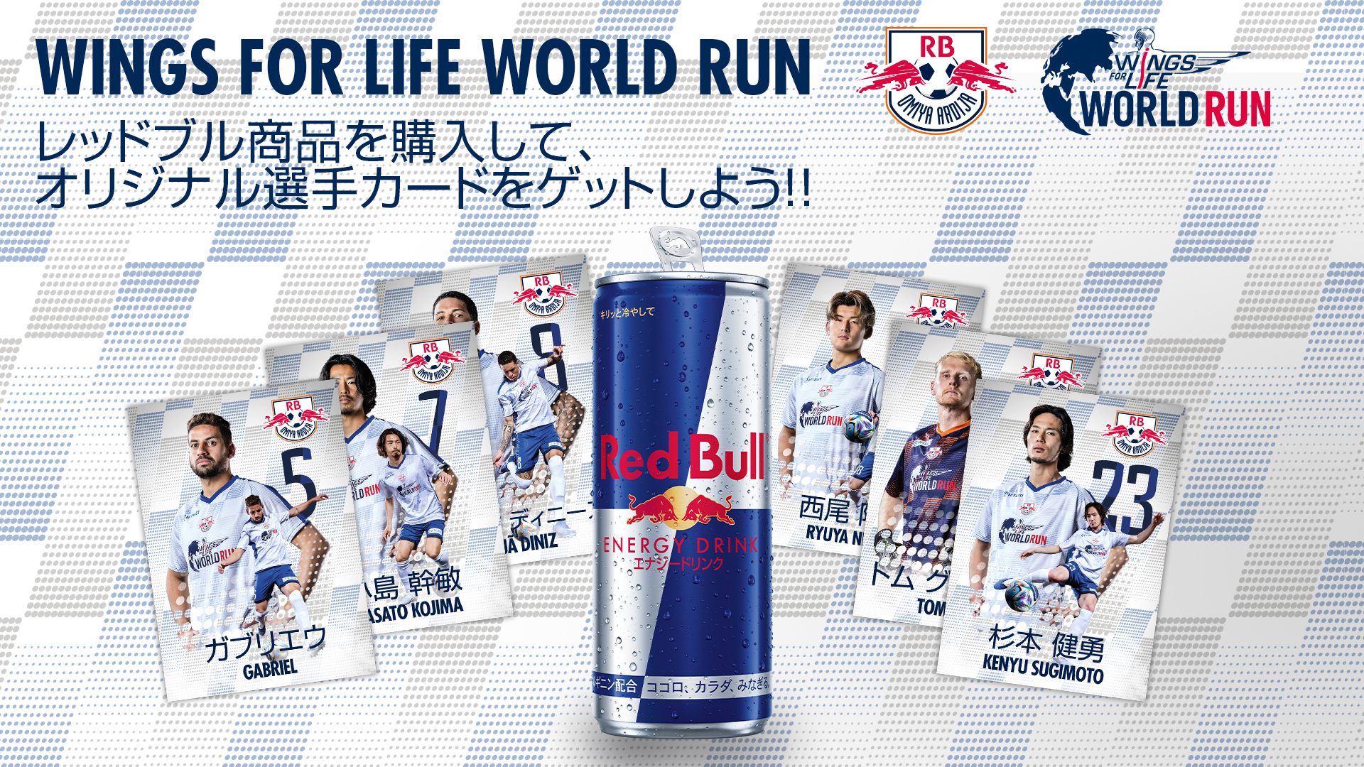 「Wings for Life World Run 2026」の開催を記念して、4/18・磐田戦~5/6・いわき戦の3試合のホームゲームにおいて、対象店舗にてレッドブルドリンク商品を購入の皆さまを対象に「Wings for Life World Run」仕様のオリジナルプレーヤーズカードをプレゼントします! ぜひ全種コンプリートを目指してコレクションをお楽しみください!